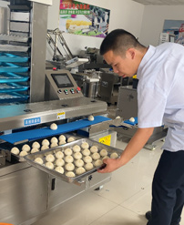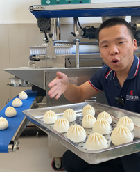 仿手工包子機采用仿手工搟面的方式將面皮壓成合適厚度。再由出餡部分將餡料填充至面皮上,經由卷面部分卷成圓柱形狀,傳送至成型部分成型,過程中不會破壞面皮筋性,保持手工原味。